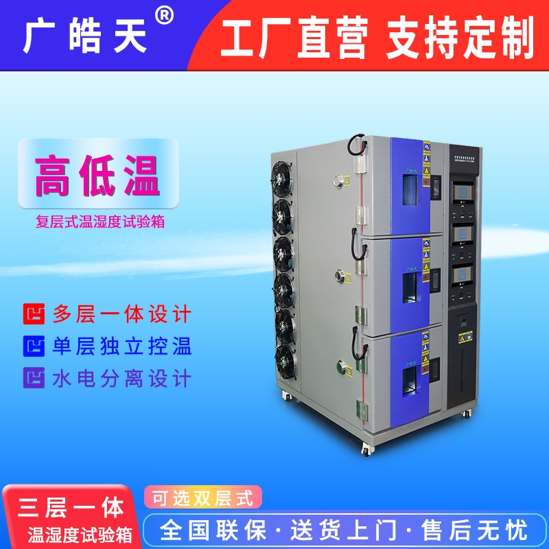 精密电子元器件在生产、运输、使用过程中,需应对高低温骤变、高湿等复杂环境,其稳定性直接决定终端产品的使用寿命与运行安全。传统单腔试验箱测试效率低、空间利用率不足,难以满足多批次、多工况同步测试需求,制约企业研发周期与产能提升。广皓天精准洞察行业需求,自主研发的复层式温湿度试验箱,以“多层独立腔+精准协同调控"为核心优势,成为精密电子行业的测试优选装备。 在某头部精密电子企业的芯片可靠性测试项目中,广皓天复层式温湿度试验箱发挥了关键作用。该企业需同步验证不同批次芯片在低温、高温高湿、交变湿热等多工况下的性能稳定性,传统设备需分批次测试,耗时费力。广皓天定制化复层式温湿度试验箱配备3个独立测试腔,层间采用高密度隔热层,有效避免温湿度交叉干扰,各腔体可独立设定-40℃~150℃温度范围、20%RH~98%RH湿度范围,控温控湿精度分别达±0.5℃、±2%RH。
